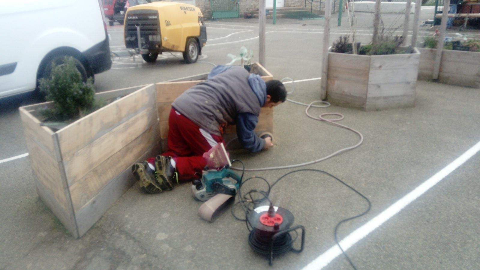 Au programme : mise aux normes pour l'accessibilité handicapé, désherbage et taille de la haie, ponçage des bacs à fleurs, réparation des jardins zens (bacs à sable), changement du grillage, et divers petits travaux (changer les porte-savons cassés, fixer un tableau, remplacer des néons ....), le tout coordonné par Mickaël Roussel, président de l'OGEC.