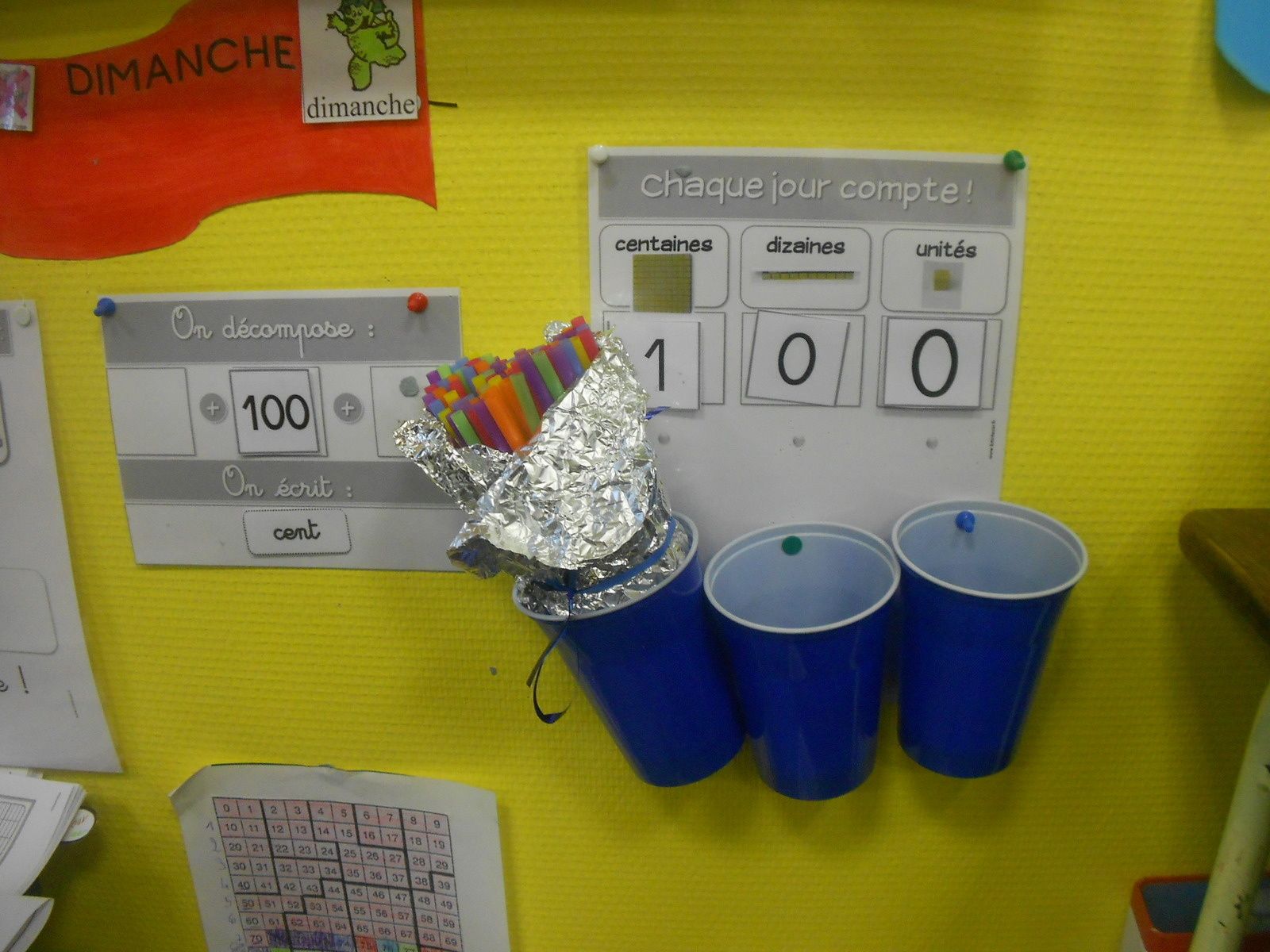 Aujourd'hui mercredi 19 Février, nous avons fêté notre 100ème jour d'école : en effet, depuis le début de l'année scolaire, nous comptons nos jours d'école grâce à des pailles que nous rangeons par paquets de 10 ( dizaines) et aujourd'hui nous avons ajouté notre centième paille !!!!